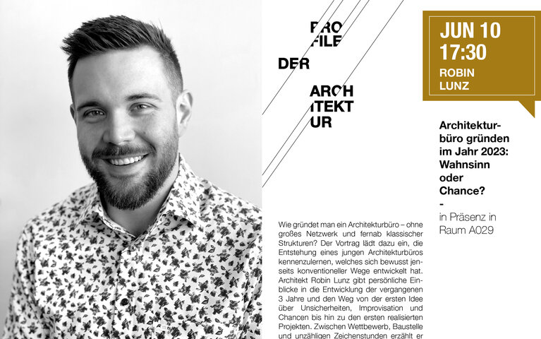 Wie gründet man ein Architekturbüro – ohne großes Netzwerk und fernab klassischer Strukturen? Der Vortrag lädt dazu ein, die Entstehung eines jungen Architekturbüros kennenzulernen, welches sich bewusst jenseits konventioneller Wege entwickelt hat. Architekt Robin Lunz gibt persönliche Einblicke in die Entwicklung der vergangenen 3 Jahre und den Weg von der ersten Idee über Unsicherheiten, Improvisation und Chancen bis hin zu den ersten realisierten Projekten. Zwischen Wettbewerb, Baustelle und unzähligen Zeichenstunden erzählt er von Umwegen, unerwarteten Möglichkeiten und dem Mut, Architektur auf eigene Weise zu denken und zu praktizieren.