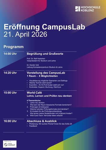 Wir freuen uns sehr auf Ihre Teilnahme und einen inspirierenden Austausch! Für Fragen stehen wir gerne unter campuslab(at)hs-koblenz.de zur Verfügung.