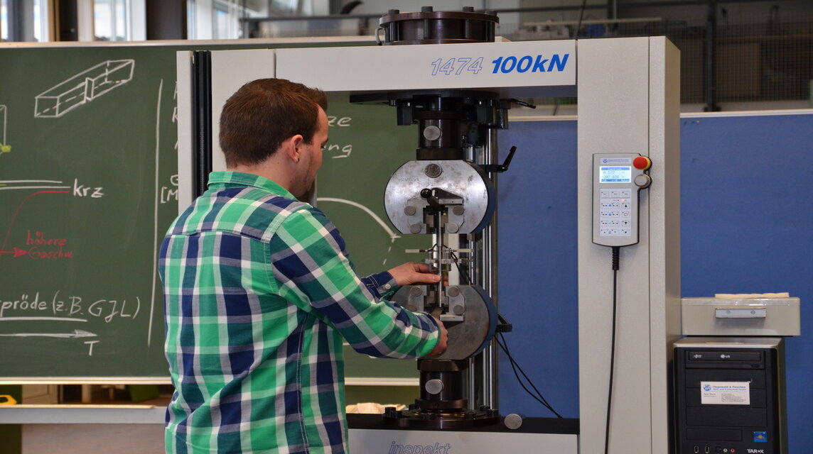Die mechanische Werkstoffprüfung ist ein zentraler Baustein bei der Untersuchung von Werkstoffen. Zug-, Druck- und Biegeversuche können bis zu einer Last von 600 kN (entspricht ca. 60 to) durchgeführt werden. Neben genormten Standardproben können auch Bauteile geprüft werden. Im Werkstoffkundelabor stehen zwei Universalprüfmaschinen zur Verfügung: