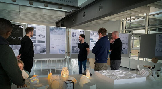 Der Prozess reichte von der ersten Idee über virtuelle Varianten bis hin zum realen 1:1 Mock-up. Das Modul forciert eine experimentelle Auseinandersetzung mit digitaler Formgebung und physischer Umsetzung.
