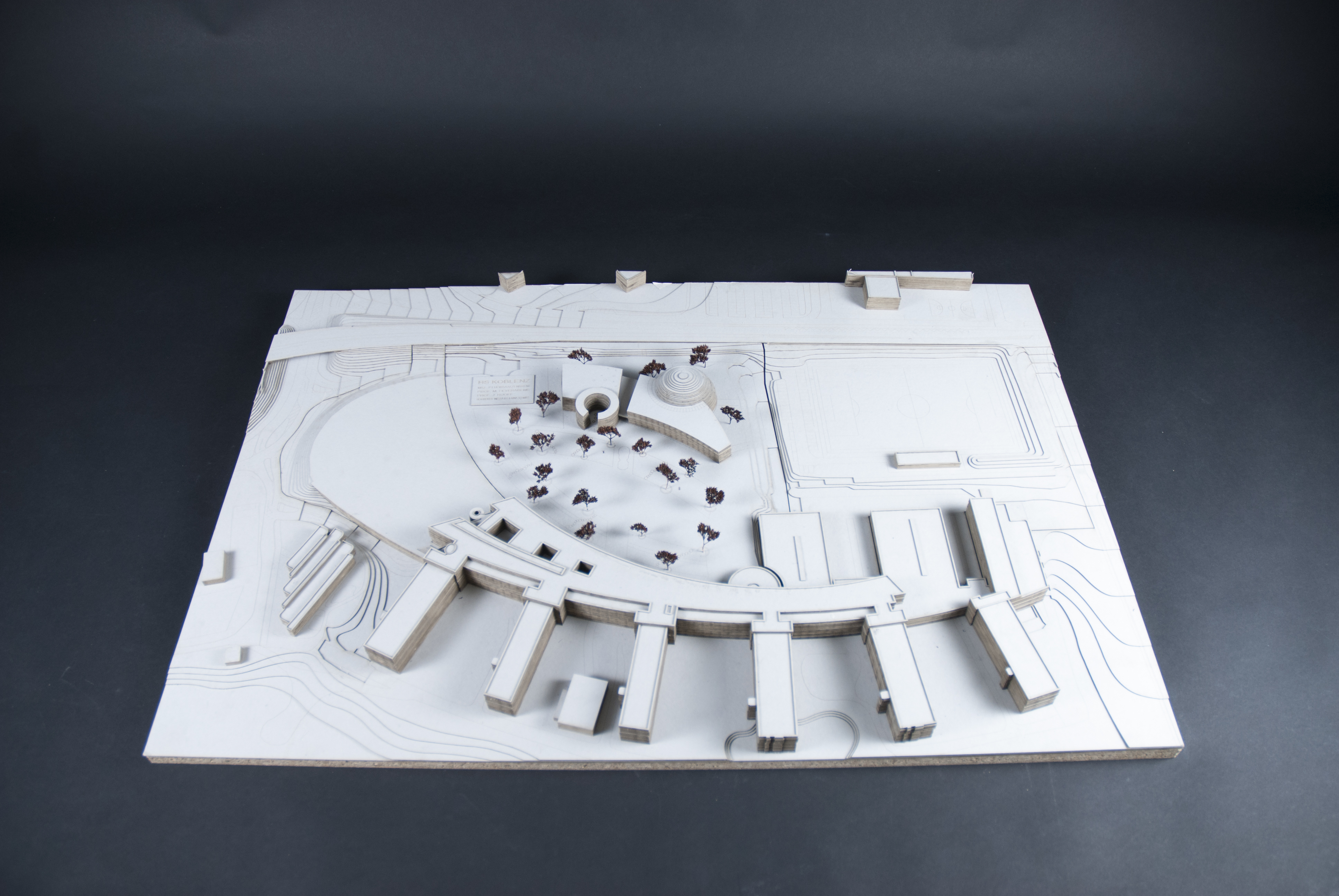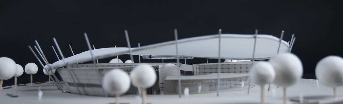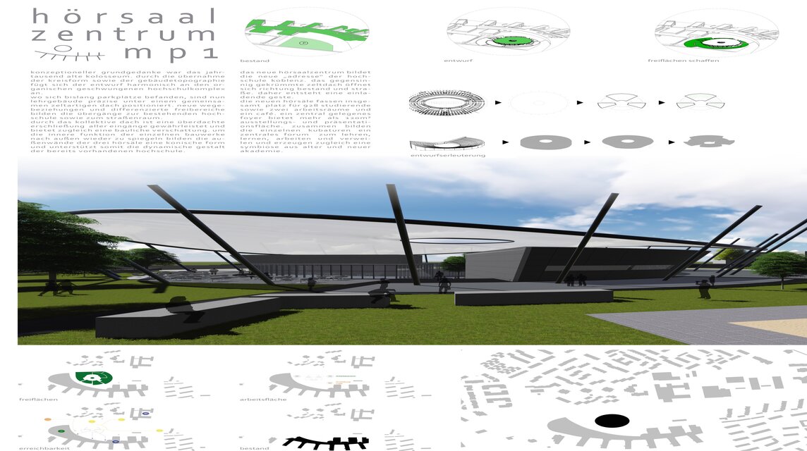 Ziel der Aufgabenstellung des MP 1 ist der Entwurf eines – fiktiven- Hörsaalzentrums auf dem Gelände des Parkplatzes vor der Hochschule Koblenz. Neben drei Hörsälen gehört auch ein großzügiges Foyer mit Cafeteria und der Entwurf des Außengeländes zur Aufgabenstellung. Besonderes Augenmerk liegt auf der Durchplanung des Tragwerks und der Fassade.