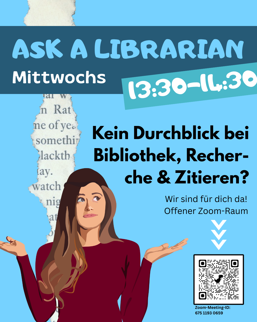 Ab dem 14.01.2026 bietet das Bibliotheksteam immer mittwochs von 13:30-14:30 Uhr eine offene Zoom Sprechstunde zu allen Fragen rund um die Bibliothek an: Literaturrecherche in Primo, Datenbanken, Literaturverwaltung etc.