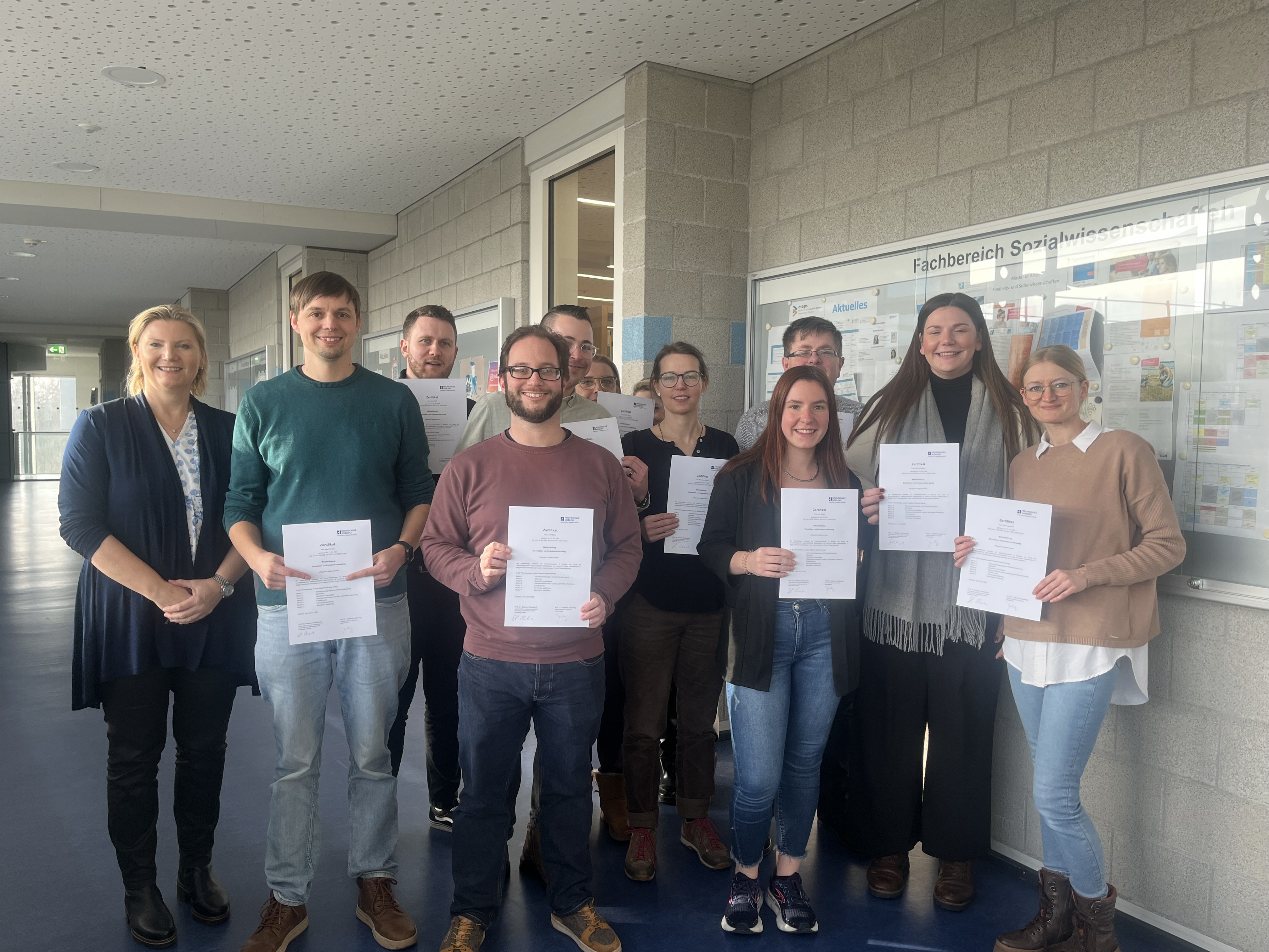 Am 17.01.2025 haben 15 Teilnehmende erfolgreich diese Weiterbildung abgeschlossen und erhielten das Zertifikat „Schuldner- und Insolvenzberatung“ der Hochschule Koblenz (siehe Foto).