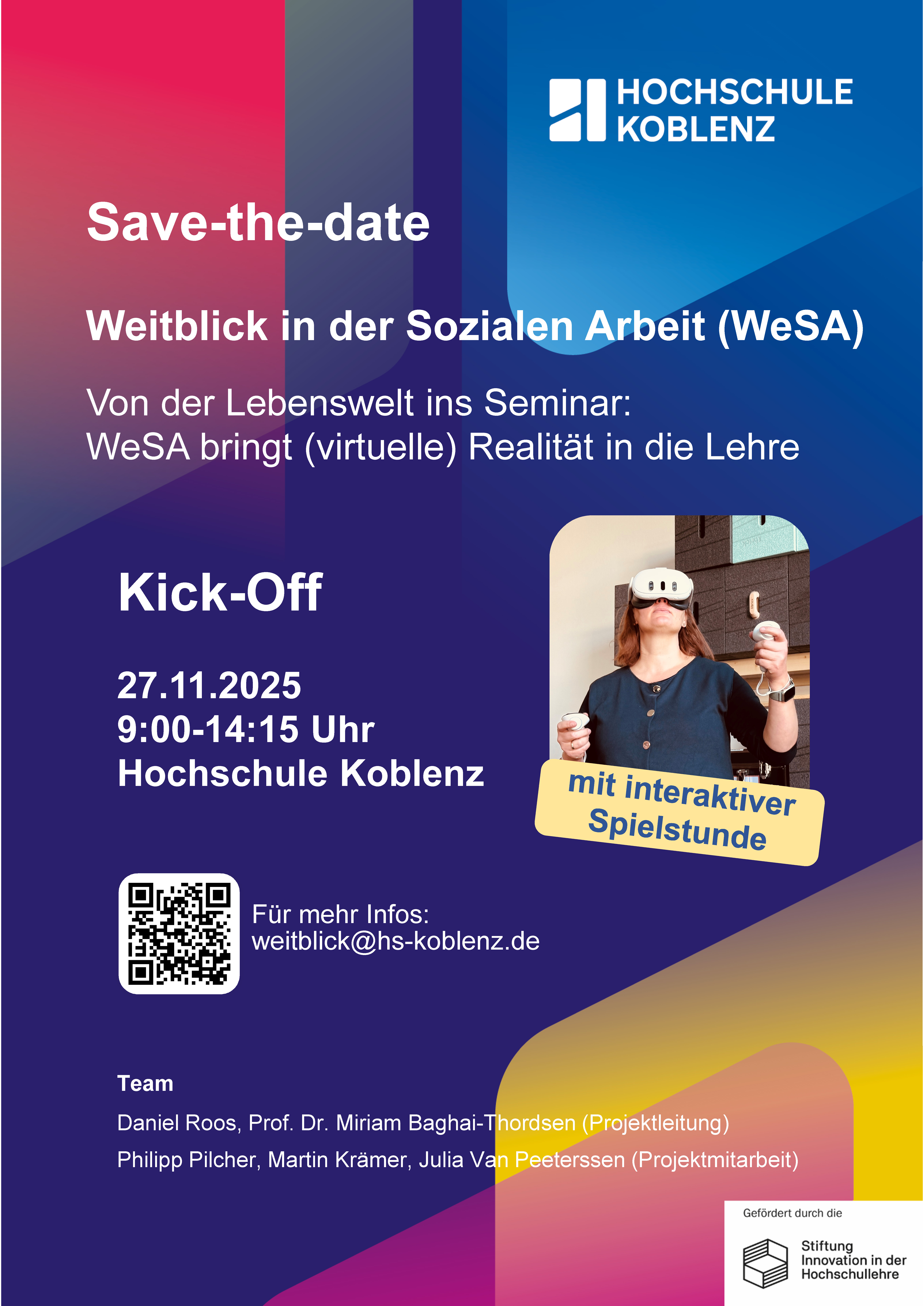 Das Projekt Weitblick in der Sozialen Arbeit („WeSA“), gefördert durch die Stiftung Innovation in der Hochschullehre, ist eine Idee zur innovativen Neugestaltung von modernen Lehr- und Lernsettings. Durch den Einsatz von 360°-Videos und VirtualReality (VR)-Technologien sollen Studierende in diesen Lehrarrangements realitätsnahe und nachvollziehbare Einblicke in die Lebenswelt von Adressat*innen