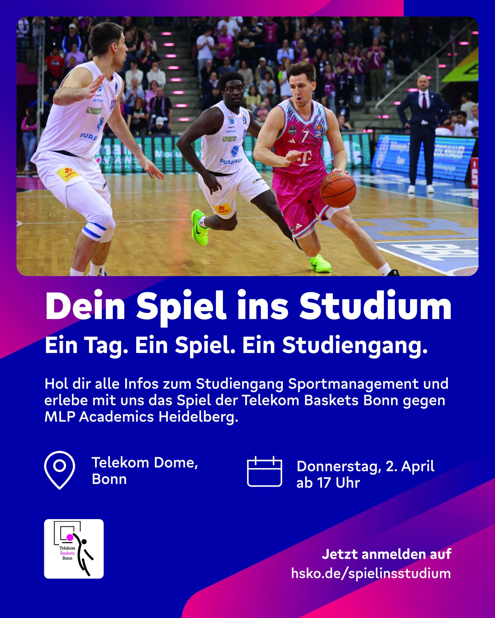 Die nächsten Veranstaltung findet am 02. April 2026 ab 17 Uhr bei den Telekom Baskets im Telekom Dome auf dem Bonner Hartberg statt. Wir werden dort beim Heimspiel gegen die MLP Academics Heidelberg zu Gast sein.