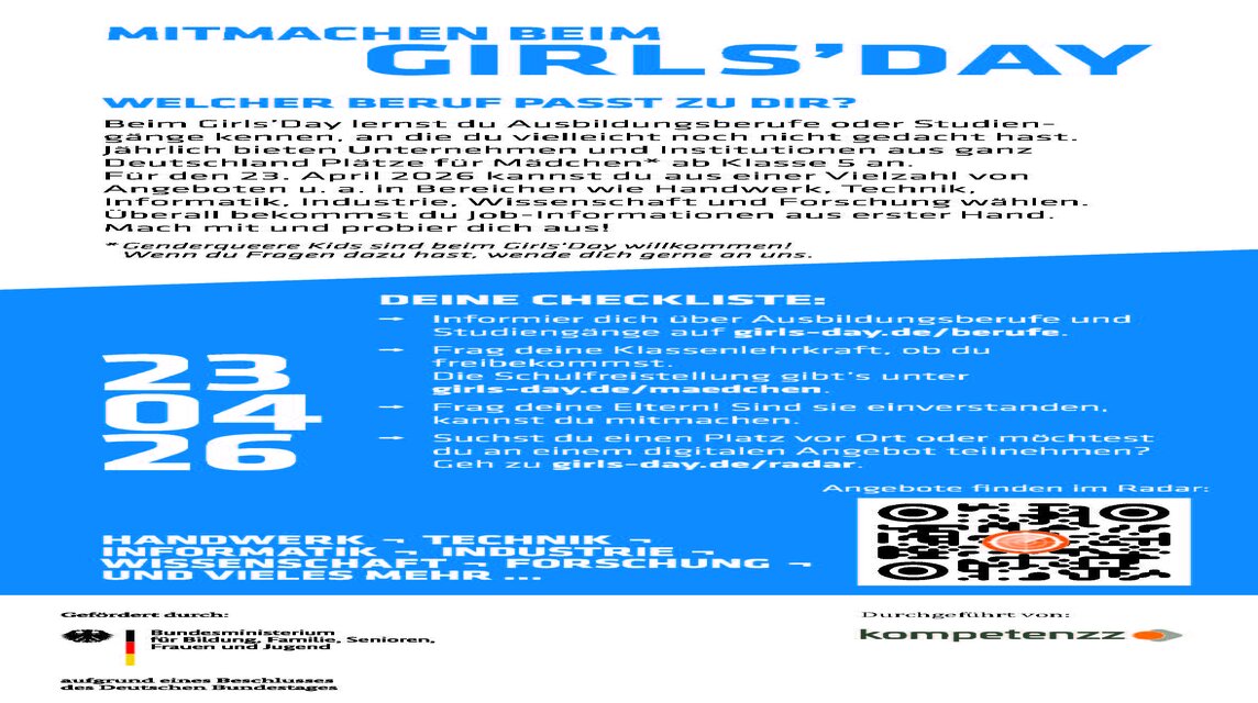Der Girls' Day ist ein bundesweiter Orientierungstag zur Berufs- und Studienorientierung von Mädchen.