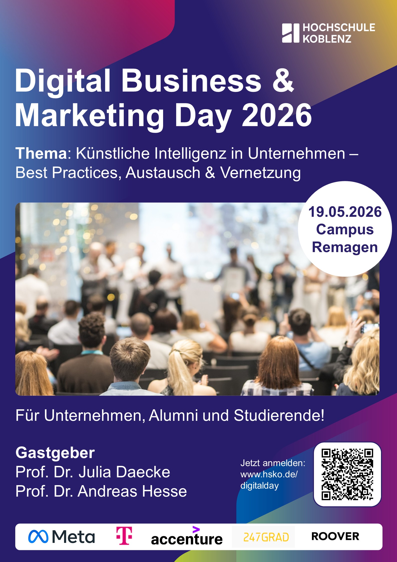 Der Digital Business & Marketing Day 2026 ist das zentrale Event für Studierende, Alumni und Unternehmen, die verstehen wollen, wie Künstliche Intelligenz bereits heute in Unternehmen eingesetzt wird und wie KI-Innovationen die Unternehmenswelt zukünftig verändern werden.