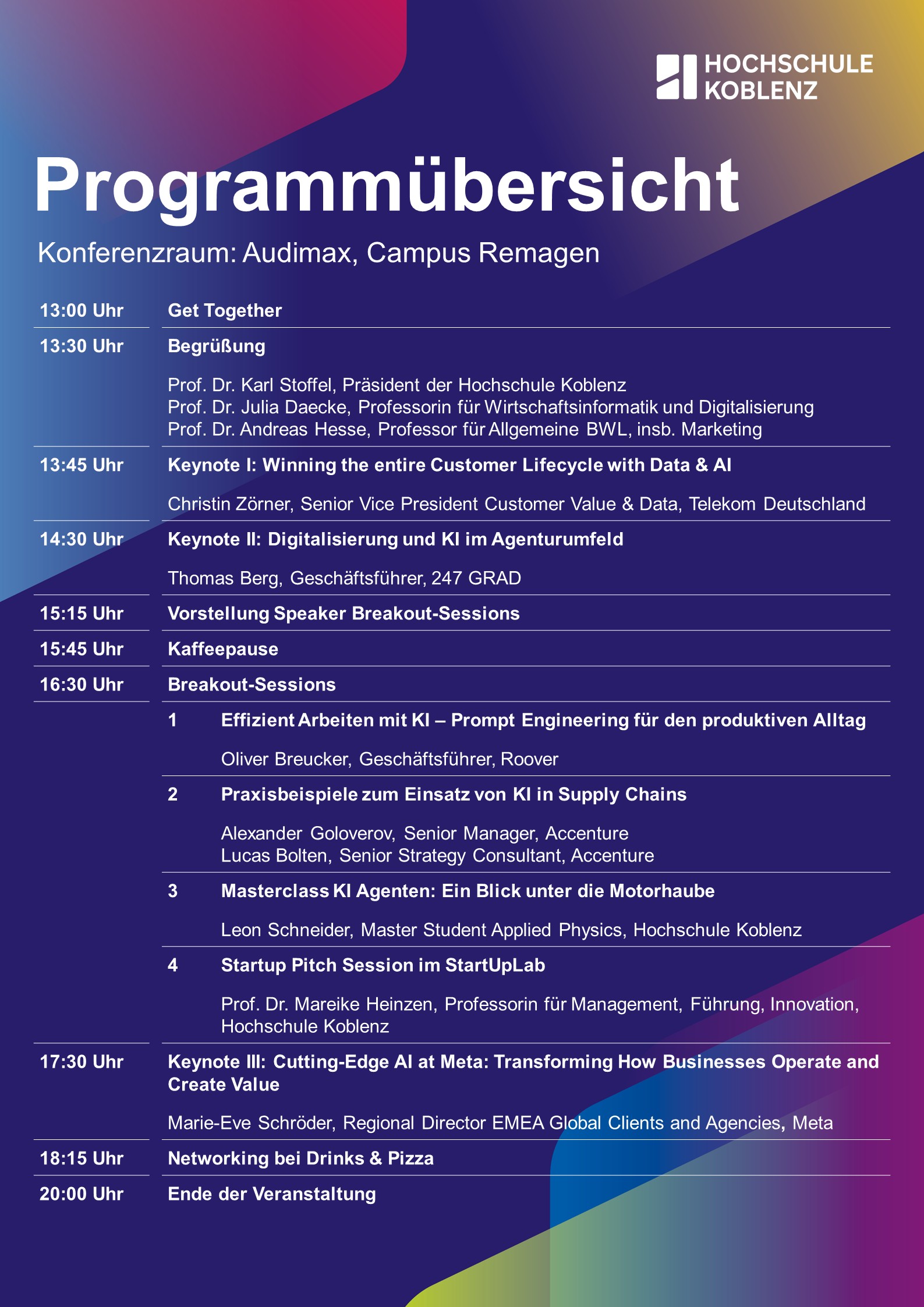 Am 19. Mai am Campus Remagen geben Top Executives führender Unternehmen exklusive Einblicke in aktuelle KI-Entwicklungen. Freuen Sie sich auf inspirierende Keynotes, interaktive Breakout Sessions, Pitches von Startups in unserem Startup Lab und eine gezielte Vernetzung zwischen Hochschule und Wirtschaft.