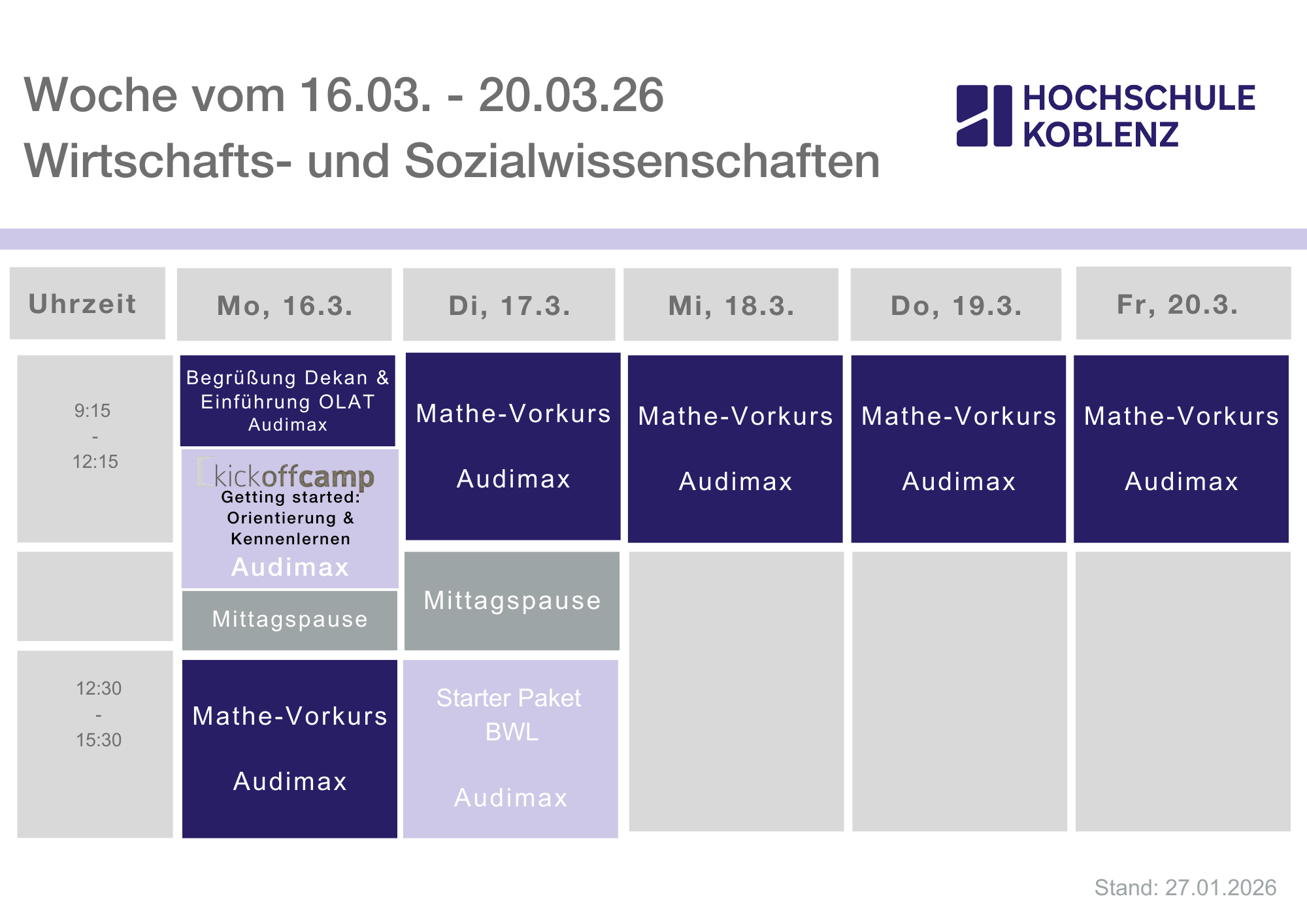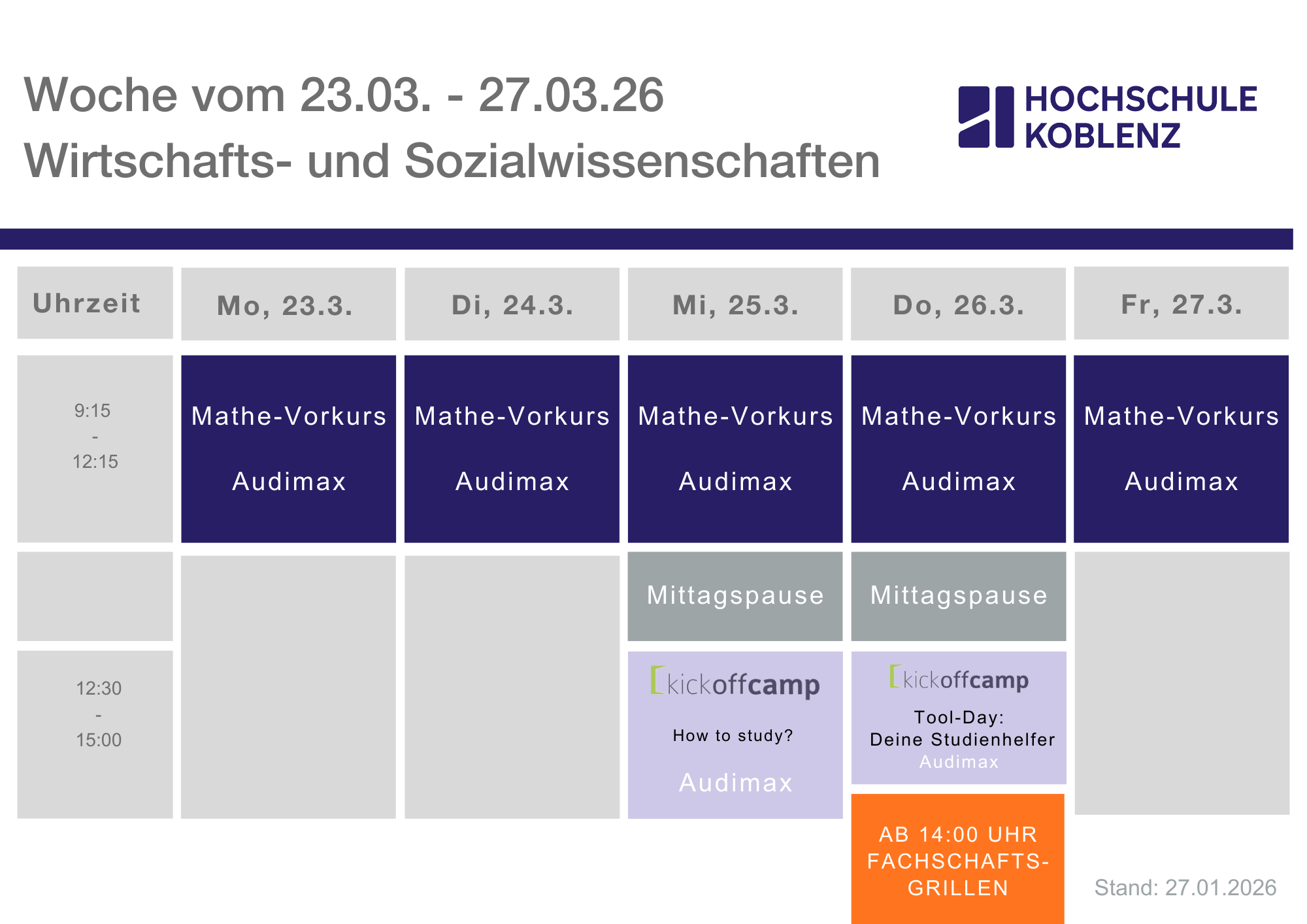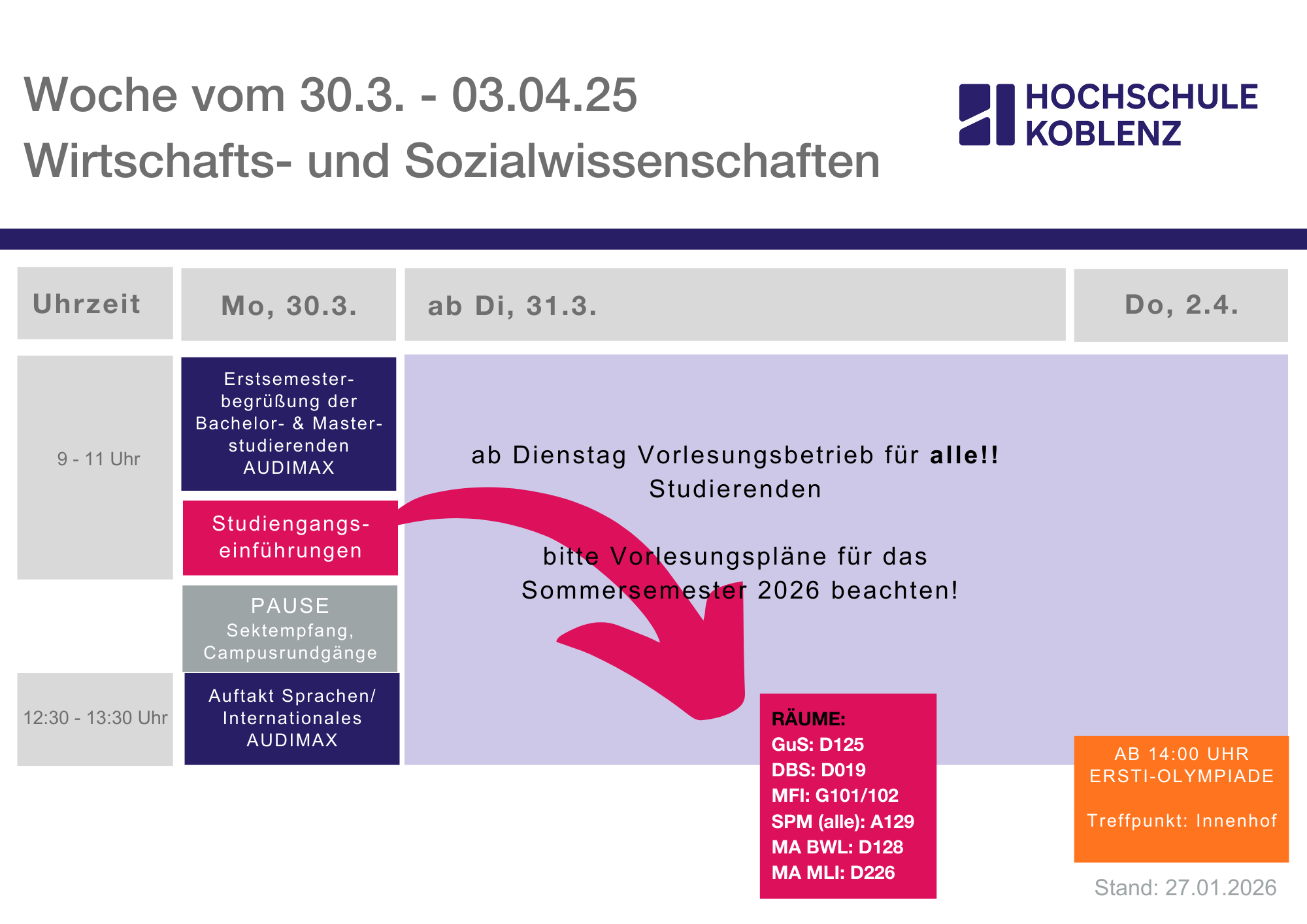 Offizielle Erstsemesterbegrüßung im Audimax | Montag, 30.03.2026, ab 9:00 Uhr |