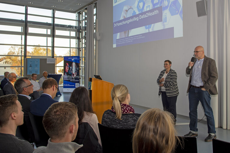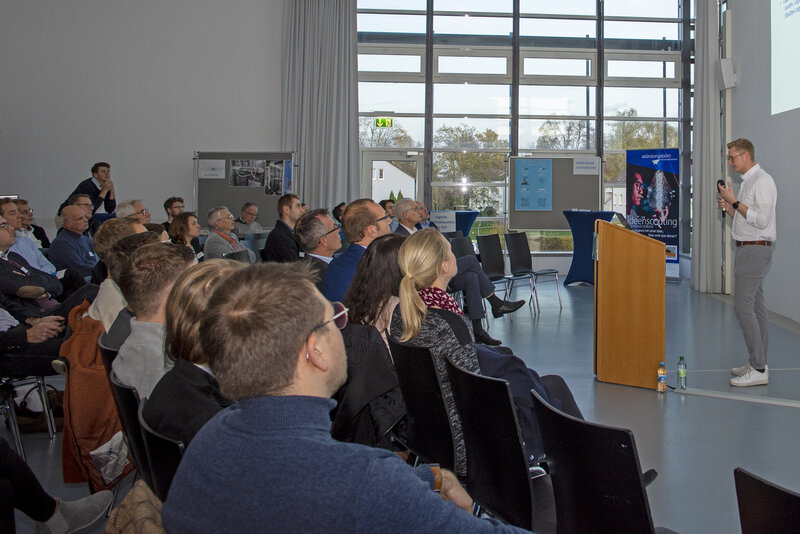 Anschließend informierten die jeweiligen Projektverantwortlichen in kurzen Vorträgen über ihre Arbeit. Prof. Dr. Maria Wimmer von der Uni in Koblenz und Prof. Dr. Maik Kschischo berichteten über das neue Forschungskolleg „Data2Health: Vertrauenswürdige Datenanalysen für das Gesundheitswesen“, in dessen Rahmen Professorinnen und Professoren beider Hochschulen in Tandems insgesamt sechs Promovierende gemeinsam betreuen werden. Den entsprechenden Förderbescheid hatte der rheinland-pfälzische Wissenschaftsminister Clemens Hoch im September überreicht. Prof. Dr. Lutz Thieme und Sören Wallrodt präsentierten ihr Projekt „Der digitale Sportstättenatlas RLP“. In diesem Forschungsvorhaben bauen sie derzeit unter Berücksichtigung der sich wandelnden Sportnachfrage eine umfangreiche Datensammlung auf, mit der auf der Grundlage des Bestands an Sportstätten, ihren Nutzungsmöglichkeiten und ihres Zustandes Entscheidungen zur Weiterentwicklung der Sportinfrastruktur in den Kommunen getroffen werden können. Hochschulabsolvent Marec Kexel, der seine Forschung am Digitalen Produktionslabor der Hochschule Koblenz in ein Startup überführt hat, erläuterte den Anwesenden, wie sich Künstliche Intelligenz einsetzen lässt, um Produktionsparameter zu optimieren.